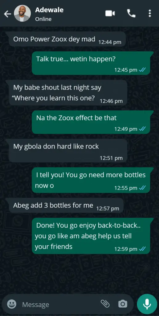 "Guy! I swear this Power Zoox na life saver. Before, once I enter like 3 mins, I don release. Shame dey catch me. But after using am for one week, babe dey call me 'engine'. 😂😂 My confidence don return. Gbola don even add weight small. No regrets!"