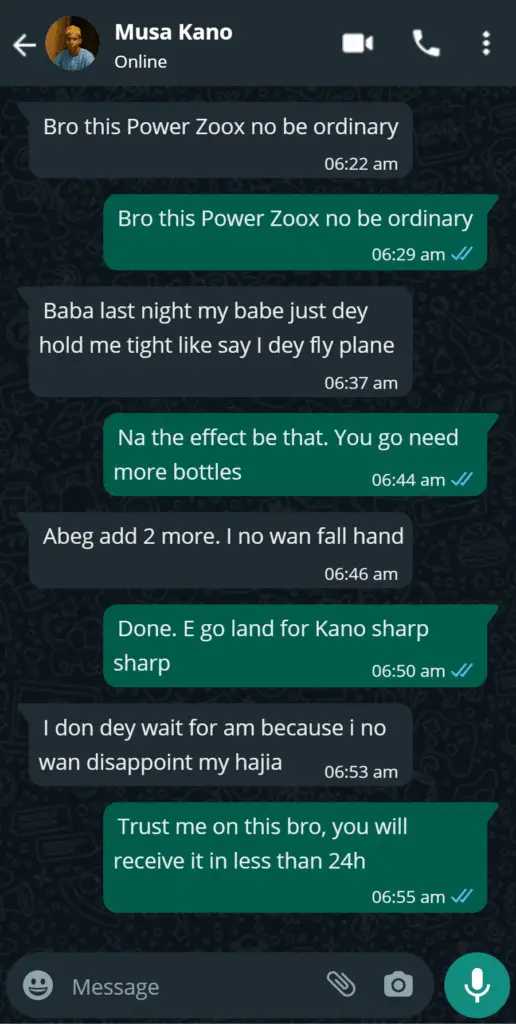 🧔🏽♂️ "Omo this thing work o. I no believe at first but I just say make I try. After 3 days, my madam dey look me with new respect. 😏 She even ask if I went to do something. I dey last like 30+ minutes now without stress. Power Zoox no be scam abeg."